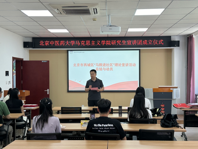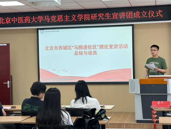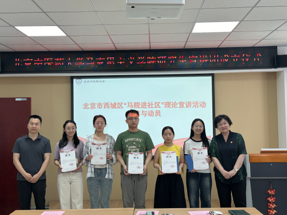 李丽娜老师总结了带领员工参与西城区“马院进社区”理论宣讲活动的成果,并进行了积极动员。在过去的一年中,马院7位研究生走进新街口街道宣讲18次,宣讲对象涉及社区工作者、退休党员、居民等500余人,在西城新街口街道取得了良好的反响。丁旭旭同学随后发表了自己参与宣讲的感言。他结合自己的实际经历,建议同学们一定要对文字稿进行反复打磨,并掌握其中每一个知识点,尤其是跟中医药相关的内容,社区居民对理论观点和中医药知识都非常感兴趣,要能经得起提问。领导和老师们为宣讲人颁发了社区宣讲的聘书和纪念品。