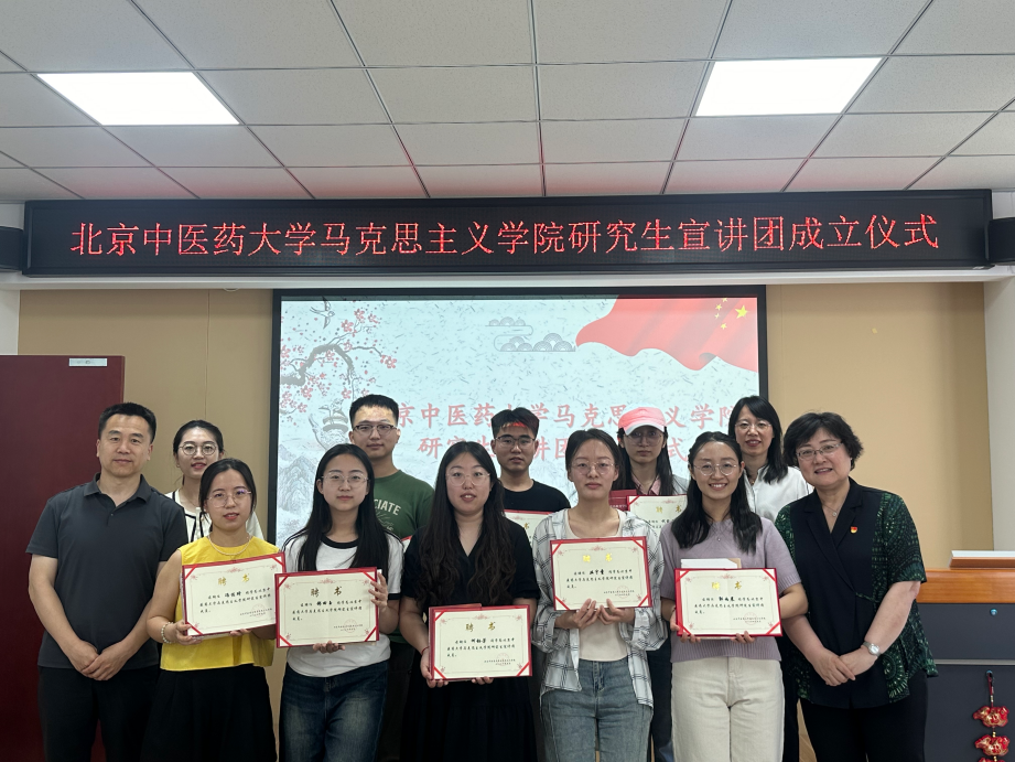 宣讲团成员共14名,包括公司22级和23级硕士研究生。李玮书记、王良滨副书记为宣讲团成员颁发聘书,并赠送图书。李书记勉励同学们发挥专业优势,将马克思主义理论学深、悟透、讲清楚,理论要有深度,宣讲要有温度,同时结合学校专业特色,把中医药的故事传播给更多人。