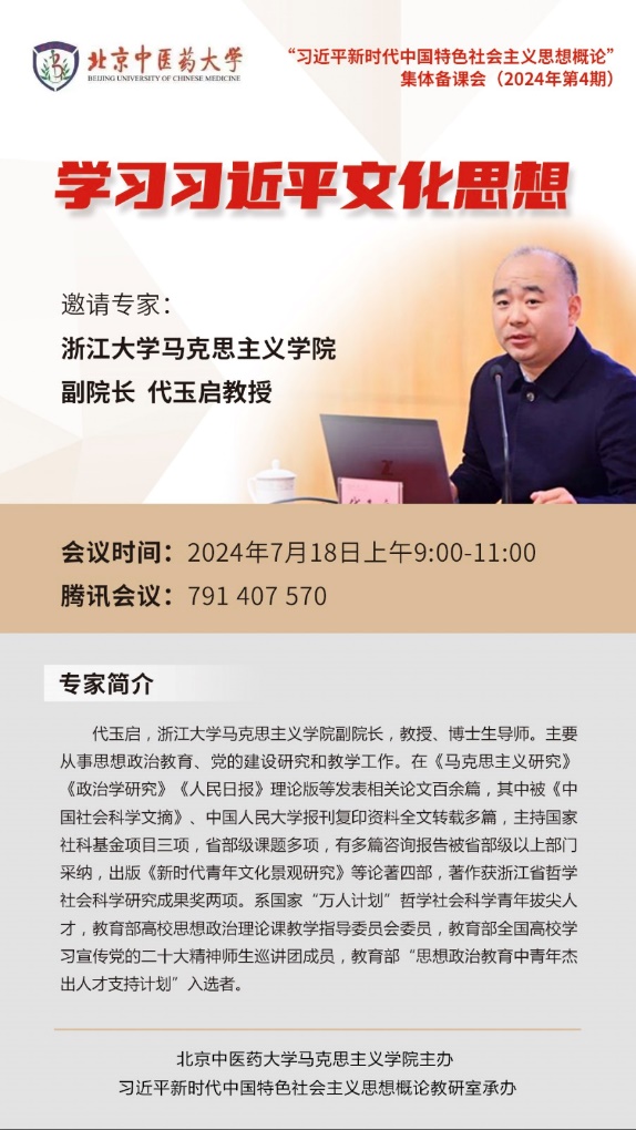 7月18日上午,由betway西汉姆联官网主办、习近平新时代中国特色社会主义思想概论教研室承办的“习近平新时代中国特色社会主义思想概论”备课会顺利举行。本次备课会邀请了国家“万人计划”哲学社会科学青年拔尖人才、教育部高校思想政治理论课教学指导委员会委员、浙江大学betway西汉姆联官网副经理代玉启教授就如何讲好“习近平文化思想”进行辅导。betway西汉姆联官网副经理裘梧致欢迎词,习近平新时代中国特色社会主义思想教研室全体教师及部分研究生共同参加。会议由教研室副主任徐蕾教授主持。