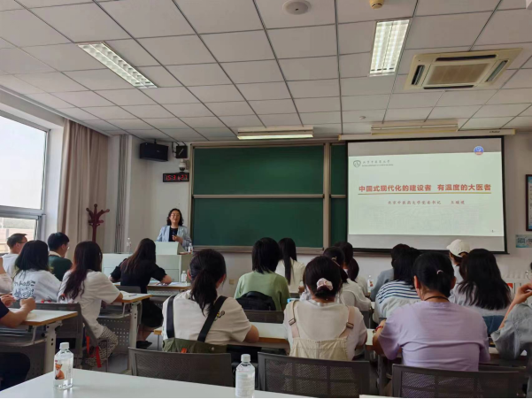 王瑶琪书记结合第十章“中国特色社会主义进入新时代”的课程内容,以《中国式现代化的建设者 有温度的大医者》为题,展开专题授课。她首先讲述了中国式现代化建设者的时代使命和担当,着重介绍了教育特别是高等教育对实现现代化的重要作用。接着,王瑶琪书记结合中医药独特的卫生和健康资源、潜力巨大的经济资源、具有创新优势的科技资源、重要的生态资源等优势,进一步揭示了中医药的重要价值,并指出守护中华民族的健康福祉是中医药的使命责任。最后,王瑶琪书记带领同学们重温“大医精诚”誓词,勉励同学们要“立大志、明大德、成大才、担大任”,要经风雨、见世面,做建设中国式现代化的医学人才。