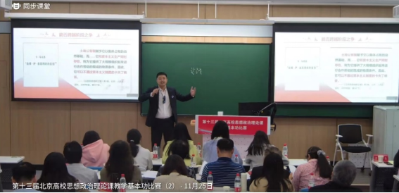 北京高校思想政治理论课教学基本功比赛由北京市委教育工委面向在京高校思政课教师举办,赛制分为预赛和决赛。预赛按照七门思想政治理论课设置七个赛道进行预赛选拔。在七个赛道预赛中获得一等奖、二等奖的选手进入决赛。孙振鹏老师参加的是“毛泽东思想和中国特色社会主义理论体系概论”课程预赛,比赛于2023年11月5日在北京大学举行。孙振鹏老师表现优异,在参赛28人中以小组第一名的成绩晋级决赛,并荣获预赛一等奖。决赛于2023年11月25日在北京航空航天大学举行,北京各高校共有65人晋级决赛,分4组展开激烈角逐,孙振鹏老师发挥出色,荣获A组第一名,斩获决赛特等奖。
