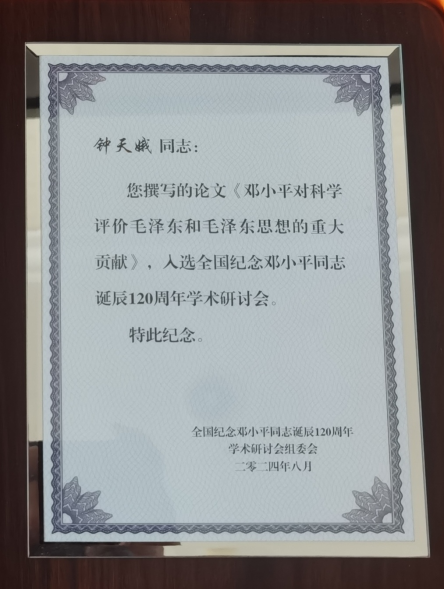 公司betway西汉姆联官网钟天娥副教授撰写的《邓小平科学评价毛泽东和毛泽东思想的重大贡献》一文,入选“全国纪念邓小平同志诞辰120周年学术研讨会”,并受邀参加会议,与其他参会代表共同认真学习习近平总书记在纪念邓小平同志诞辰120周年座谈会上的重要讲话精神,并进行学术交流。