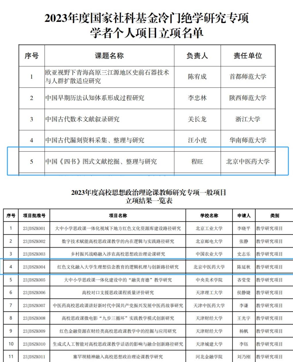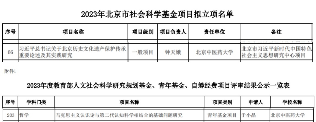 此外,本年度学院还立项多项国家级、省部级以上课题,包括国家中医药管理局课题、全国中医药高等教育“十四五”规划课题、全国党建研究会高公司党建研究专业委员会课题、北京市高公司党建研究课题、北京市中医管理局课题、北京市医院管理中心课题等。2023年学院还出版专著3部;发表CSSCI论文7篇,其中《人民日报》(理论版)文章2篇;2篇智库报告被国家网信办采纳,呈送相关部门和领导参阅,收获颇丰。社会服务方面,教师主撰《古代医家论医德医风医道》读本被国家中医药管理局印发面向中医药全行业推广,学院参与北京市医院管理中心人文科室验收与研究工作,促进首都医学人文建设。 学院高度重视省部级及以上项目的申请与立项工作,通过申报辅导、课题配套等多种方式激励广大教师积极申报课题,推进团队建设与科学研究工作。同时,学院项目申报与立项工作得到了校科技处的大力支持和指导。望新一年度学院科研成果再创新高。