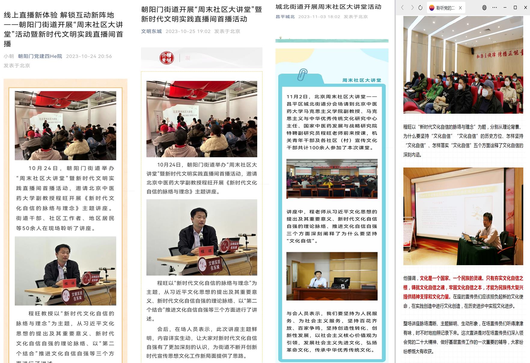 近期,betway西汉姆联官网程旺老师应北京周末社区大讲堂邀请,先后赴东城区朝阳门街道、怀柔区怀柔镇政府、昌平区城北街道开展理论讲座活动。这是程旺老师此前多次深入西城、通州、大兴等基层讲座后,再次为北京周末社区大讲堂进行讲座。