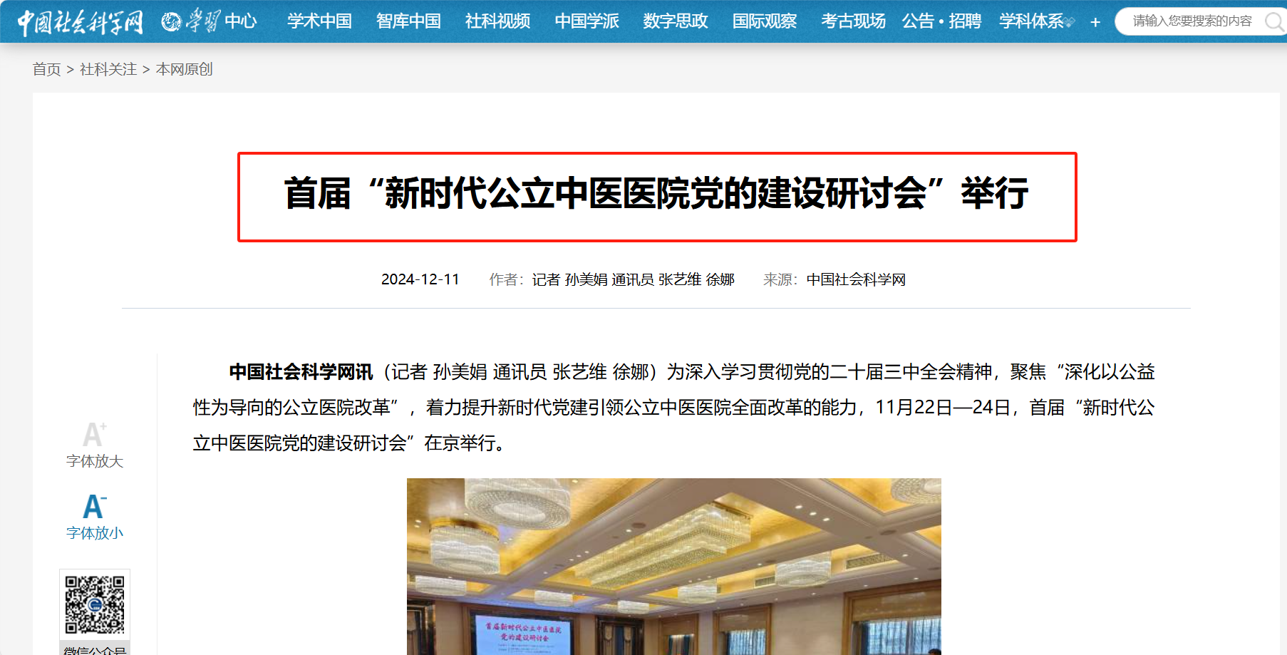 2024年11月23日由betway西汉姆联官网、betway西汉姆联官网党的建设与中医药发展研究中心主办的“首届新时代公立中医医公司党的建设”研讨会在西藏大厦召开。来自全国各地的30余家公立中医医院,以及各高校、媒体单位共80余名专家学者共同出席了本次研讨会。会议围绕新时代公立中医医公司党建工作面临的新挑战、新任务以及加强公立中医医公司党建工作的对策建议展开深入交流。